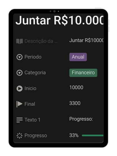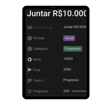 Organizador de Metas totalmente digital, com separação por períodos, mensais, bimestrais, semestrais e anuais. Com acompanhamento do andamento de todas as metas